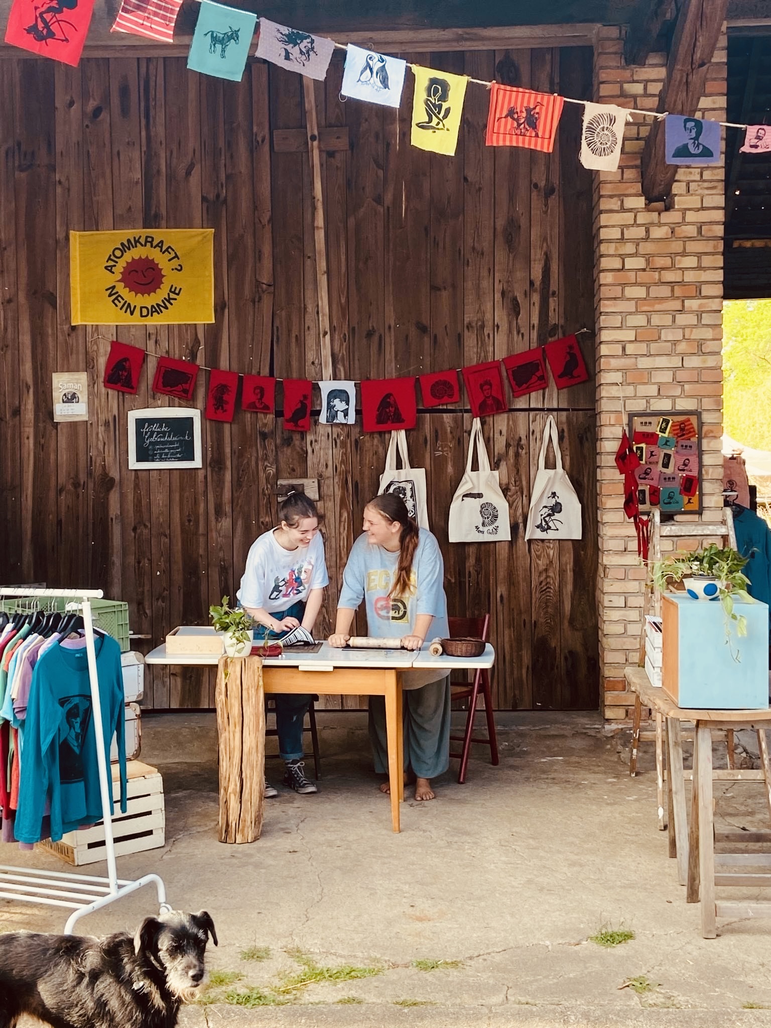 Moin, wir sind Hannah & Fredda, gemeinsam nennen wir uns Kirschkerndrucken, da diese Wortneuschöpfung gleich zwei unserer liebsten Tätigkeiten vereint. So sind wir ganz vernarrt in das Gefühl des gleitenden Kernes, wenn man ihn über die Zunge schnalzt, sowie in den meditativen Prozess des Schnitzens & Druckens von Hand. Gerne könnt ihr eure eigene helle Kleidung mitbringen, um sie von unsvor Ort bedrucken zu lassen. Alle Klamotten und Flicken die wir zum Verkauf anbieten sind second-hand.
