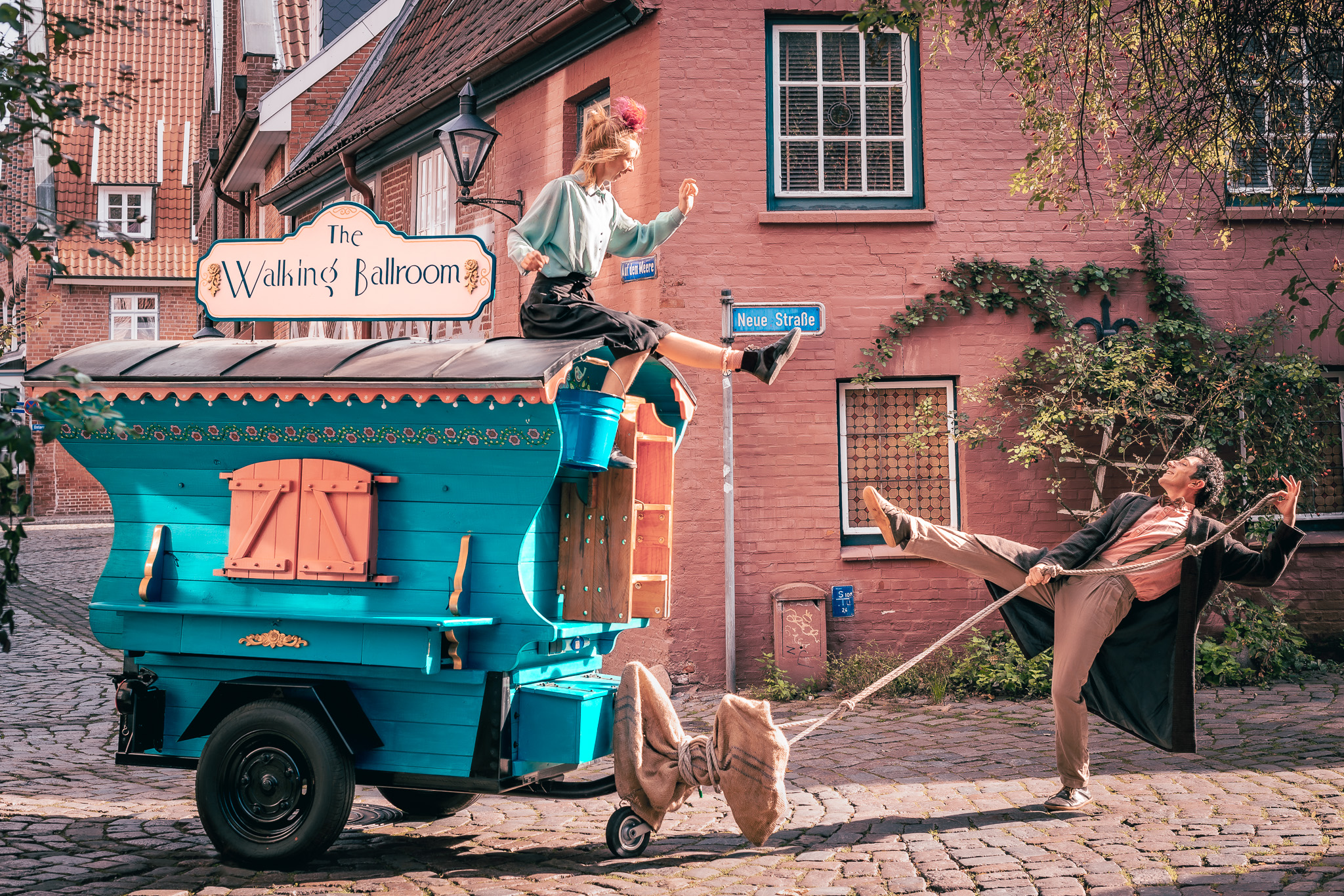 Ein seltsames Paar mit einem großen Traum und einem bezaubernd winzigen Wagen, eine Geschichte von Liebe und Abenteuer und die unbändige Lust am Tanzen. Das sind die Zutaten dieses lustigen Cocktails, zu dem uns „The Walking Ballroom“ einlädt. Ein reisender Tanzsaal, den man nicht mehr verlassen – oder besser gesagt – dem man überallhin folgen möchte. Ein Ort des bunten Zusammenkommens von Individualitäten allen Seins. Sich lebendig und verbunden fühlen, sich zu freuen, zu jubeln, zu triumphieren – das ist es, was sie suchen und das ist es, was sie teilen. Eine mitreißende Clownsshow für die ganze Familie, bei der die Kinder sich kringeln vor Lachen und die Erwachsenen ihre Liebe zum Leben neu entdecken.